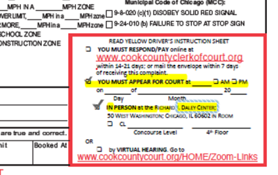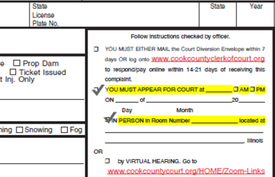 NOTE: If the ticket is marked "YOU MUST APPEAR," you are not eligible for Court Diversion and must appear. Note the courtroom, date, and time listed on your ticket. You or your attorney must appear in court at this time. There are no automatic continuances, and court dates and times cannot be changed over the phone.